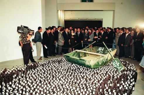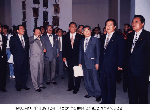 1995년 광주비엔날레 당시 국회문공위 의원들에게 전시를 설명하는 필자.