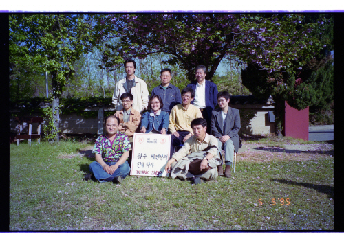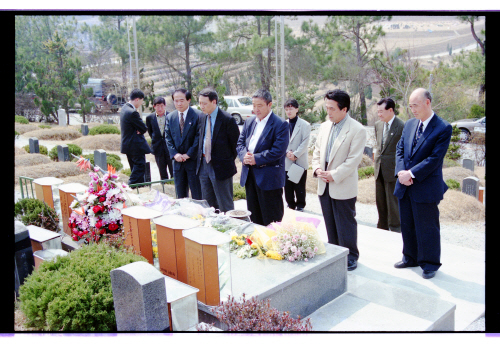 백남준 선생 방문 당시 구 망월 묘역 참배 모습(앞줄 왼쪽부터 당시 이호준 비엔날레 관리본부장, 이용우 비엔날레조직위원회 전시기획실장, 비디오 아티스트 백남준, 강봉규 비엔날레 조직위 집행위원장).