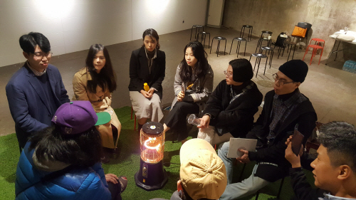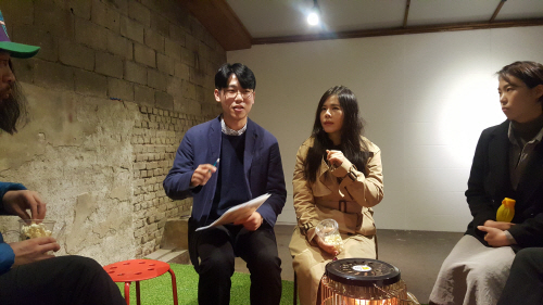 뽕뽕브릿지의 레지던시 작가로 입주해 활동을 펼치고 있는 대만 타이페이의 미디어 아티스트 황멍언(왼쪽 두번째)이 지난 27일 오후 4시 작품 ‘잘자! 내 반란군 소녀들아!’ 상영회 뒤 토크쇼에서 관람객들의 질문에 답하고 있다.