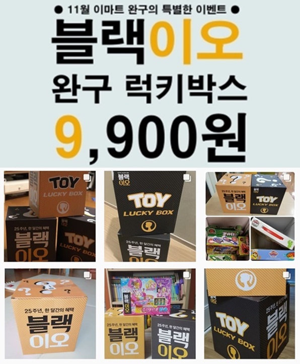 이마트는 지난 1일부터 창립 25주년을 맞아 진행하는 블랙프라이데이 '블랙이오' 행사의 일환으로 럭키박스를 판매 중이다. 럭키박스란 3만원에서 8만원 상당의 완구가 무작위로 들어있는 랜덤 상자를 뜻한다. 가격도 9900원으로 매우 저렴해 순식간에 각종 이마트 온·오프라인에서 품절되는 등 인기를 얻고 있다.