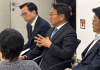 이용섭 광주시장이 27일 오후 시청 브리핑실에서 민관공동대책위원회 위원들과 함께 코로나19 관련 온라인 브리핑을 하고 있다.