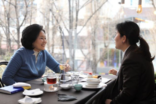 박영선 더불어민주당 서울시장 예비후보가 최근 미 FDA 승인된 ‘최소잔량형(LDS)주사기’를 개발한 풍림파마텍 조미희 부사장이 서울 종로구 삼청동에서 만나 지난 12월부터 긴박하게 진행됐던 주사기 금형 및 스마트공장 설립 과정, 미국 FDA 긴급승인 신청까지 55일간의 소회를 나누고 있다. 2021. 2. 19.