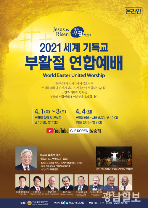 범세계적인 목회자 단체를 비롯해 기독교지도자연합(CLF)이 주최하는 ‘2021 세계 기독교 부활절 연합예배’가 유튜브(Youtube)를 통해 전 세계에 중계된다.