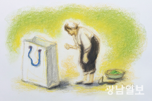 고샅을 나선 아내가 동네 어귀를 가리켰다. 밭 가운데 고추밭을 매는 할머니가 보였다. 동네 가운뎃집에서 몸이 불편한 육십 대 아들과 사는 효천댁 할머니였다. 마음 바빠 죽겠는데 무슨 일이냐고 불퉁거렸지만 아내는 들은 체도 하지 않고 고추밭으로 내달렸다. 쇼핑백을 건네자 할머니가 멍한 얼굴로 아내를 쳐다봤다. 두 사람은 쇼핑백을 사이에 두고 받아라, 못 받는다, 한동안 몸짓으로 실랑이를 벌였다. 아내는 결국 밭고랑에 쇼핑백을 내려놓고 돌아섰다. 귀가 들리지 않는 할머니가 돌아서는 아내를 향해 소리쳤다. 손주놈 등록금도 아직 못 갚았는디…. 몇 년 전 손자 등록금 좀 빌려달라는 할머니의 눈물 바람에 마음이 약해진 아내는 다음 날 거금 오십오 만원을 건네고 말았다. 이번에도 그때처럼 오지랖이 발동했겠지. 나는 보지 않았어도 쇼핑백에 든 물건이 뭔지 알 것 같았다.