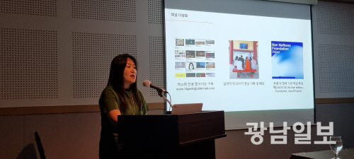 참여작가를 발표하며 작품을 성명하고 있는 이숙경 예술감독