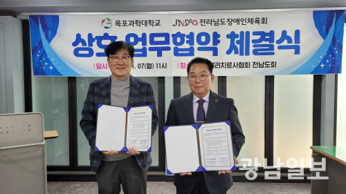 전남장애인체육회와 목포과학대는 7일 목포과학대(대한물리차료사협회 전남도회) 1층에서 장애인 체육선수 등급분류사 양성과 지역 장애인체육 발전을 위한 업무협약을 체결했다.