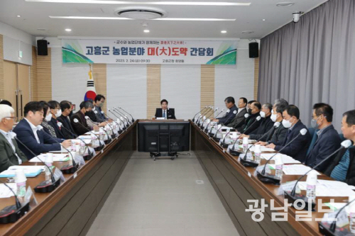 고흥군은 최근 군청 흥양홀에서 농업인과 함께 농정의 새로운 성장 동력을 마련하기 위해 농·축산 관련 직능단체 대표 30여명과 ‘농업 분야 대도약을 위한 간담회’를 개최했다고 26일 밝혔다.