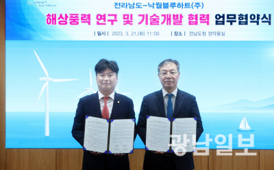 전남도는 국내 첫 대규모 해상풍력단지로 조성 중인 영광 낙월 해상풍력단지에서 산업 발전의 밑거름이 될 연구 및 기술 개발을 위해 21일 도청 정약용실에서 낙월블루하트㈜와 업무협약을 체결했다.