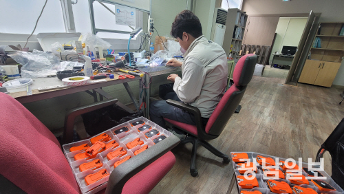 포비드림 직원이 광주 진곡산단에 위치한 공장에서 인명구조경보기를 조립하고 있다.