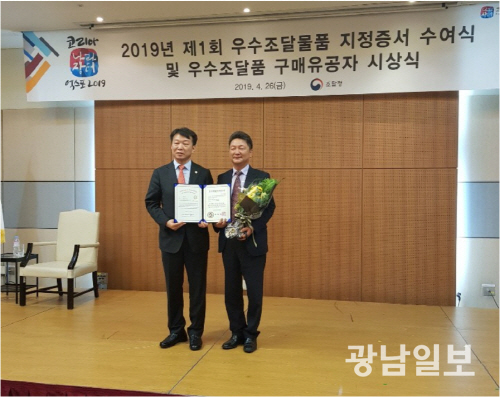 허관 포비드림 대표(오른쪽)가 2019년 4월 조달청에서 우수조달물품 지정증서를 받았다.