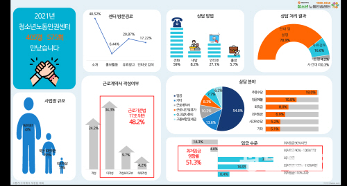 상담 분야(중복응답)를 보면 2021년에는 임금이 575회(53.95%)로 가장 많았고, 신고절차·문의 등 146회(13.75%), 근로계약 및 근로계약서 108회(10.17%), 근로시간 및 휴가 88회(8.28%), 고용보험 및 세금 66회(6.21%), 징계해고 30회(2.82%) 등의 순으로 나타났다.