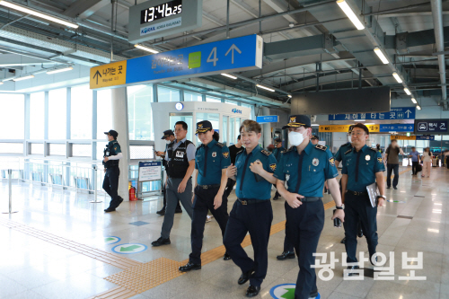 임용환 광주경찰청장이 송정역에서 특별 방범활동을 벌이고 있다.