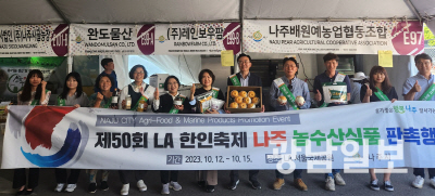 LA한인축제 농수산물 엑스포전에서 나주 농특산물 홍보 판촉 활동을 하고 있는 윤병태 나주시장.