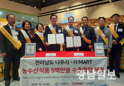 윤병태 시장, 최우진 H마트 사장은 미국 현지 기준 지난 14일 뉴저지 H마트 리지필드점에서 수출협약서에 각각 서명하면서 나주 농수산식품 수출 확대를 위해 상호협력을 약속했다.