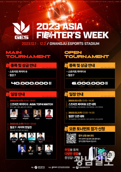 광주시가 주최하고 광주정보문화산업진흥원이 주관하는 이번 대회는 인기 격투게임을 주제로 하는 ‘파이터즈 위크(FIGHTER’S WEEK)’ 형태로 치러진다. 12월1일에는 ‘스트리트파이터6’ 종목이, 2일에는 ‘철권7’ 종목이 진행된다.