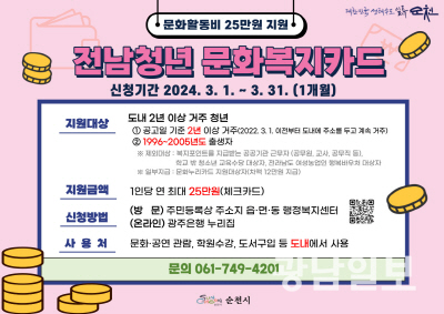 전남청년 문화복지카드는 순천시에 거주하는 청년에게 공연관람, 학원수강, 도서구입 등 문화복지비를 지원하는 사업으로 올해에는 전년 대비 5만원 증액된 1인당 연 최대 25만원을 지원한다.