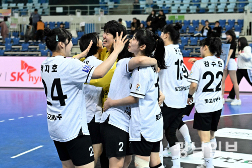 지난 2일 인천 남동체육관에서 열린 신한 SOL페이 2023-2024 핸드볼 H리그 부산시설공단전에서 승리한 광주도시공사 여자핸드볼팀이 기뻐하고 있다.