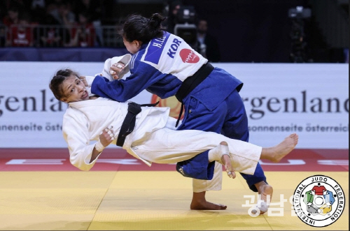 광주교통공사 이혜경이 지난 9일(한국시간) 오스트리아 린츠에서 열린 2024 오스트리아 그랑프리 유도대회 -48㎏급 동메달결정전에서 바르가스 레이 메리 디(칠레)를 상대로 안다리 후리기 절반을 따내고 있다.