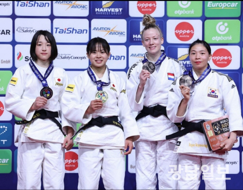 광주교통공사 이혜경이 지난 9일(한국시간) 오스트리아 린츠에서 열린 2024 오스트리아 그랑프리 유도대회 -48㎏급에서 동메달을 차지한 뒤 시상대에서 포즈를 취하고 있다.