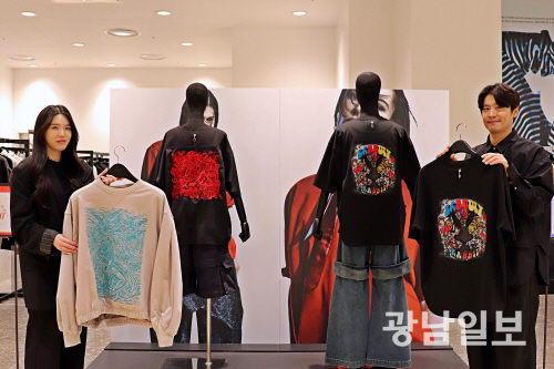 광주신세계 본관 1층에서 직원들이 송지오 옴므X위너브라더스 콜라보제품을 선보이고 있다.