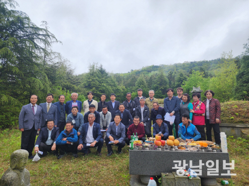 함평이씨 지평공파 삼강비 유적지화 사업을 위해 모인 후손들이 기념사진을 찍고 있다.