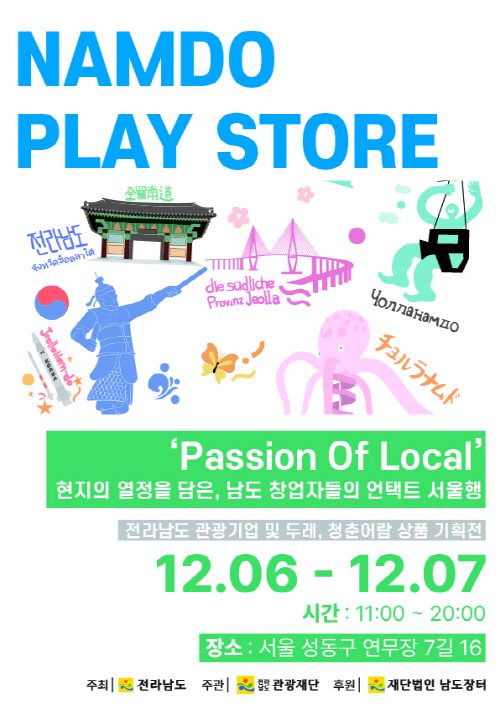 전남도는 6일부터 이틀간 서울 성수동에서 지역 관광기업제품 홍보 및 판로 확대 지원을 위한 ‘남도 플레이스토어’를 운영한다고 4일 밝혔다.
