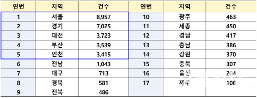 전국적으로는 서울과 경기가 각 8957건, 7025건으로 가장 많은 것으로 확인됐다.