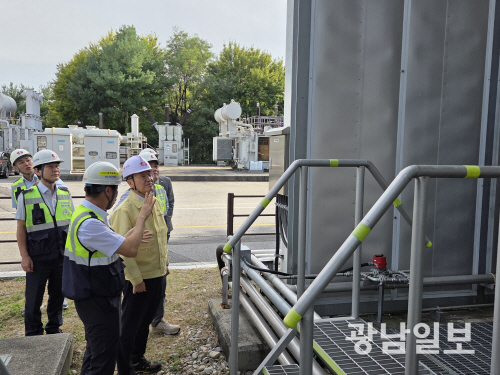한국전력은 추석 연휴 기간 정전으로 인한 국민 불편을 최소화하기 위해 전국 전력설비에 대한 특별점검을 진행했다. 사진은 미금변전소의 전력설비를 점검 중인 서철수 전력계통부사장.