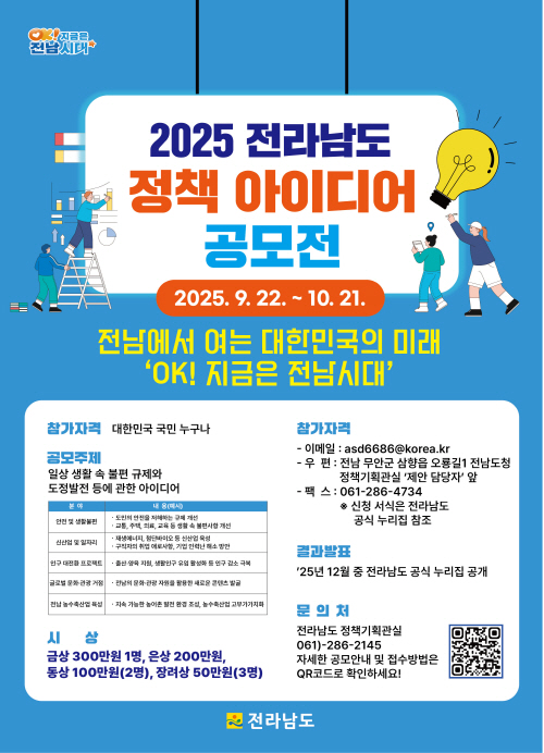 전남도가 새 정부의 실용주의 기조에 맞춰 ‘생활 속 불편을 찾고 이를 개선할, 지역의 미래를 먹여 살릴 정책’을 주제로 ‘2025년 전남도 정책 아이디어 공모전’을 개최한다.