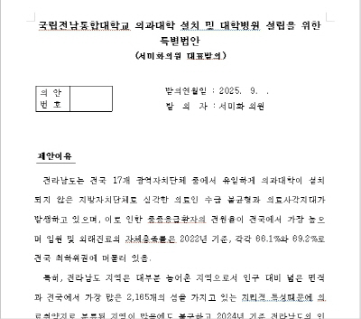 서미화 의원은 “전남의 숙원이자 이재명 정부 국정과제인 전남 통합국립의대 신설은 이재명 정부의 국정과제인 만큼 조속히 신설돼야 한다”며 “소관 부처인 복지부, 교육부의 적극적인 지원이 필수적”이라고 말했다.