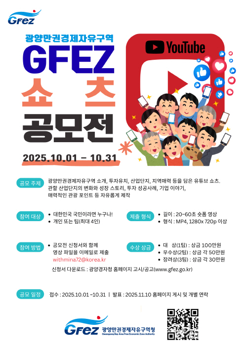 광양만권경제자유구역청은 오는 31일까지 국민 참여형 ‘2025GFEZ유튜브 쇼츠 공모전’을 개최한다.