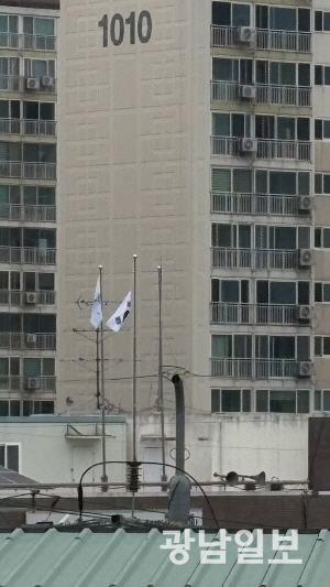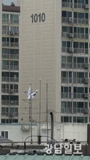 하지만 이중 태극기는 한쪽 끈에 의지한 상태로 훼손, 수일째 너덜거리고 있었다. 비와 바람이 심했던 지난 7~8일에는 곧 떨어질 듯 위태로운 모습이었다.
