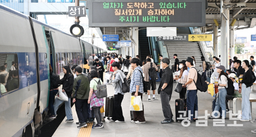 추석연휴 마지막날인 9일 오전 광주 송정역에서 고향의 넉넉한 정을 가슴에 담은 귀경객들이 용산행 KTX 열차를 타고 있다.