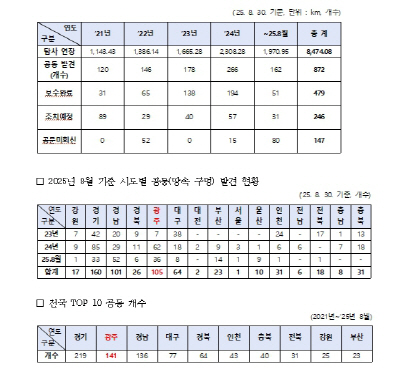 이 중 보수가 완료된 곳은 479개에 불과해, 나머지 45%(393개)에 달하는 공동이 아직 방치된 상황이다.