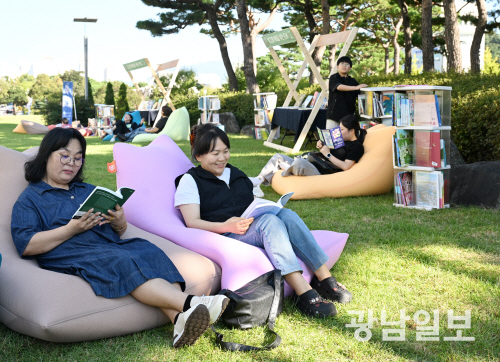 11일 오후 광주시청에서 열린 ‘2025 빛고을 책 한마당’을 찾은 시민들이 야외광장 도서관에서 책을 읽고 있다.