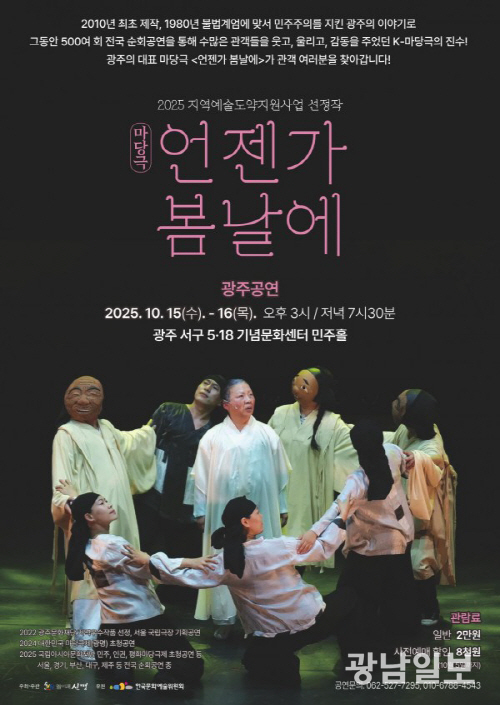 ‘언젠가 봄날에’는 지난 2010년 5·18광주민중항쟁 30주년을 기념해 초연된 이후 500여 회 지역과 전국을 순회했다. 1980년 5월 당시 행방불명자와 남겨진 가족의 이야기로, 국가폭력의 상처와 인간의 존엄, 잊혀져 가는 기억을예술적으로 승화하는 마당극이다.
