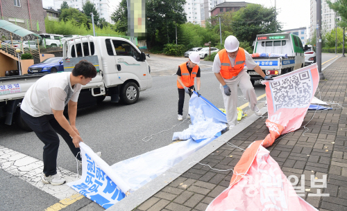 13일 광주 서구청 도시재생과 광고물관리팀 직원들이 관내 도로변에 설치된 불법 현수막을 철거하며 도심환경 정화 활동을 펼치고 있다.