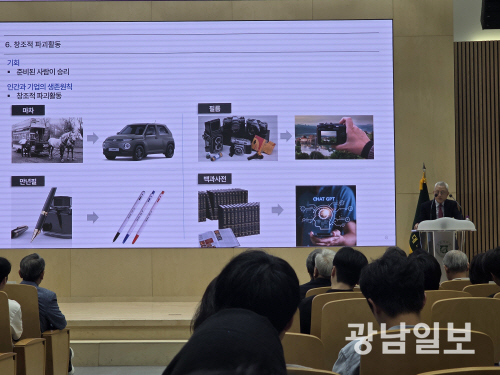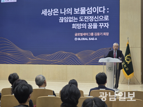 김웅기 글로벌세아그룹 회장이 14일 광주 북구 전남대학교 대학본부 2층 용봉홀에서 열린 ‘2025 제3회 전남대 용봉포럼’에서 ‘세상은 나의 보물섬이다’란 주제로 강연을 하고 있다.