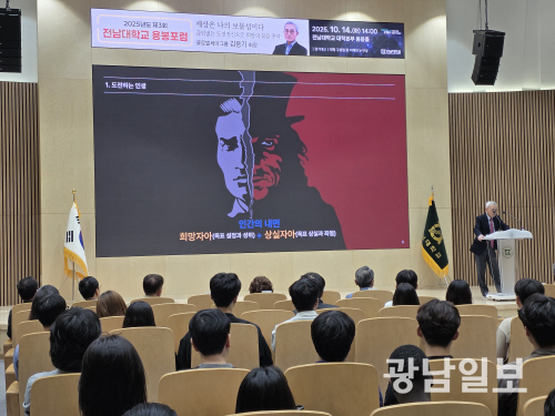 14일 광주 북구 용봉동 전남대학교 대학본부 2층 용봉홀에서 열린 ‘2025 제3회 전남대 용봉포럼’에 강연자로 나선 김웅기 글로벌세아그룹 회장이 ‘세상은 나의 보물섬이다’란 주제 강연을 하고 있다.