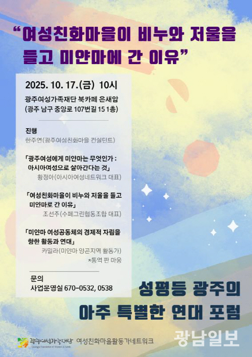 광주여성가족재단 관계자는 “이번 포럼은 분쟁지역 여성들의 트라우마 회복과 생계 기술 훈련을 통한 경제적 자립을 지원해온 광주여성친화마을과 미얀마 여성 활동가들의 값진 연대 경험을 시민들과 공유하는 중요한 장이 될 것”이라고 밝혔다.