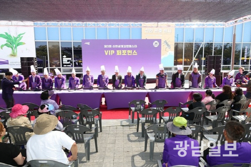 제3회 신안세계김밥페스타에 참가한 관계자들이 현장에서 신안 1004 김밥을 만드는 퍼포먼스를 펼치고 있다.