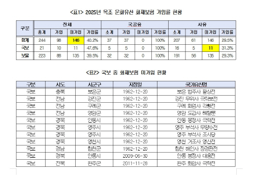 국회 문화체육관광위원회 소속 민형배 의원(더불어민주당, 광주 광산을)이 16일 국가유산청으로부터 제출받은 자료에 따르면, 전국 목조 문화유산 244건 중 146건(59.8%)이 화재보험에 미가입 상태였다.