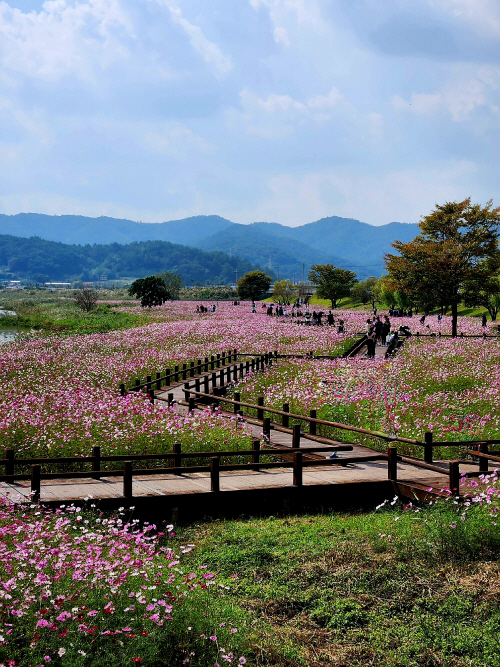 신선한 가을바람에 흩날리는 억새와 갈대, 코스모스를 배경으로 낭만 가득한 추억을 만들어 볼 수 있는 장소다.