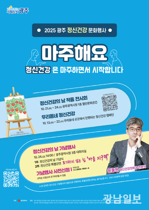 광주시가 주최하고 광주광역정신건강복지센터와 5개 자치구 정신건강복지센터, 중독관리통합지원센터가 공동 주관해 열리는 이번 행사는 ‘정신건강은 마주하면서 시작합니다’를 주제로 시민과 함께하는 다양한 프로그램을 선보인다.