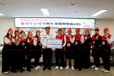 광주신세계 임직원 봉사단은 16일 대한적십자사 광주봉사관에 무료 급식을 위한 식비를 지원하고 배식 봉사를 펼쳤다.