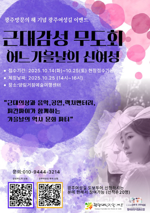 이번 행사는 광주여성길 도보투어 참가자들을 대상으로 진행되며, 1900년대 초 광주의 근대문화를 오롯이 느낄 수 있는 체험형 문화행사로 기획됐다. 전통과 서양문화가 공존하던 시기의 여성상을 재조명하며, 과거와 현재를 잇는 감성 힐링의 장으로 마련된다.