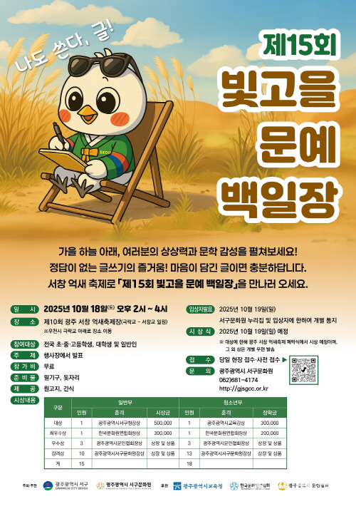 정인서 서구문화원장은 “억새밭을 배경으로 한 백일장은 광주의 가을을 대표하는 풍경이 되었다”며 “상상력과 감성이 깃든 시민들의 글을 통해 지역의 문화적 감수성이 더욱 깊어지길 바란다”고 전했다.