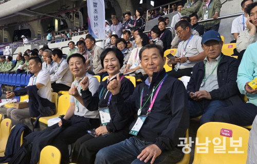 광주시의회 명진 교육문화위원장과 조석호 의원 등이 지난 17일 부산 아시아드주경기장에서 열린 제106회 전국체육대회 개회식에 참석해 광주 선수단과 대회 관계자들을 응원했다.