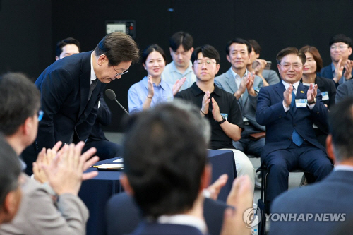 이재명 대통령이 지난 25일 광주광역시 국립아시아문화전당에서 열린 ‘광주시민·전남도민 타운홀미팅’에서 인사하고 있다.(연합)