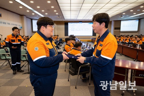 고재윤 광양제철소장이 AI활용 아이디어 공모전에서 선정된 사원에게 시상하고 있다.